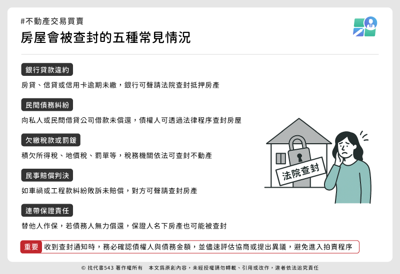 • 民間債務糾紛:向私人或民間借貸公司借款卻無力償還,債權人透過法律程序查封房屋。