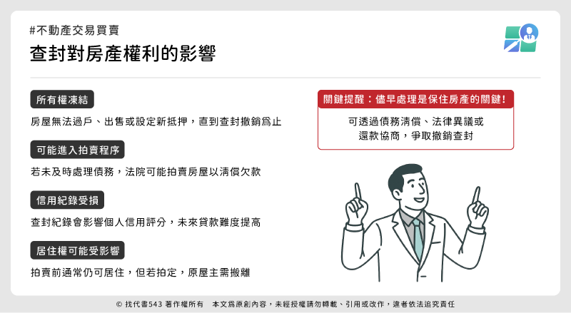 ✅ 所有權凍結:無法過戶、出售或設定新抵押,直到撤銷查封為止。