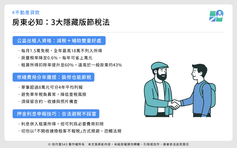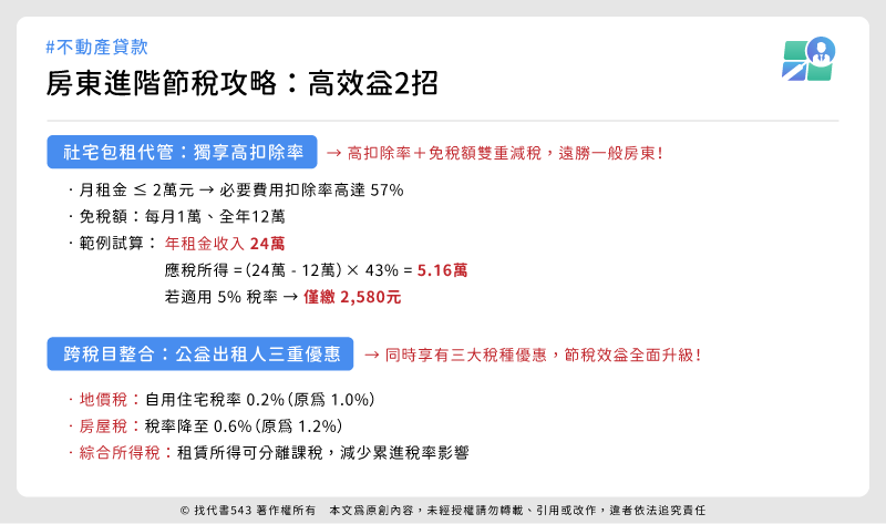 - 綜合所得稅減免:租賃所得可再扣除60%必要支出(一般房東僅能扣43%)。