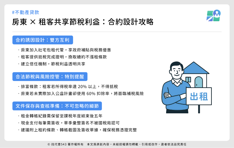 - 租客配合條款:約定租客提供「抵稅完成證明」換取房東續約不漲租。